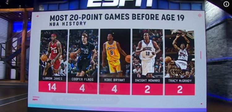 弗拉格19岁前砍下4场20+与科比并列历史第二 詹姆斯14次第一